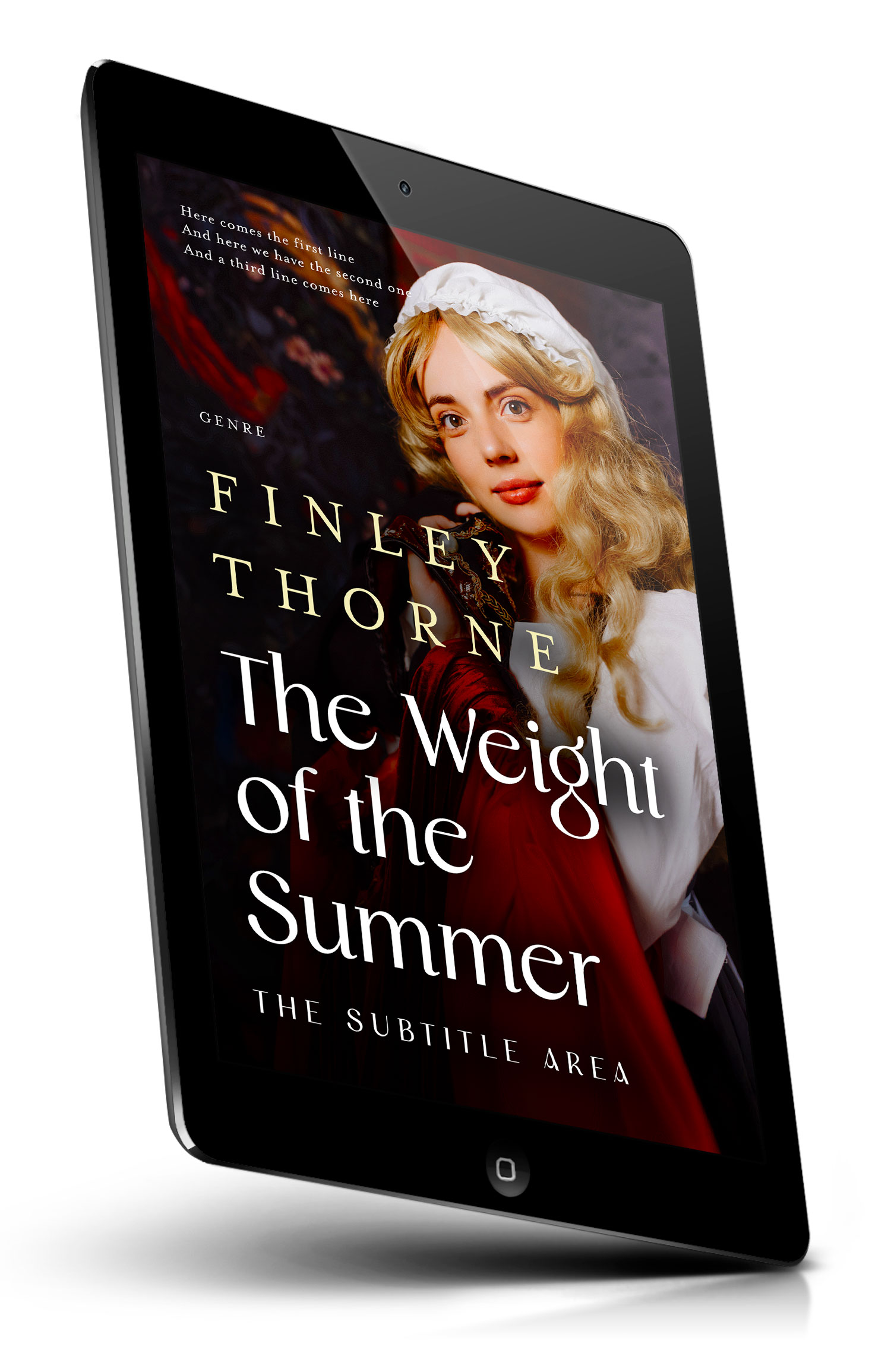 Tags: historical fiction, period costume, bonnet, blonde hair, portrait, young woman, romantic, vintage dress, lace collar, soft lighting, dramatic backdrop, elegant, classic, renaissance style, painterly, red fabric, mystery, victorian era, literary, book cover