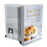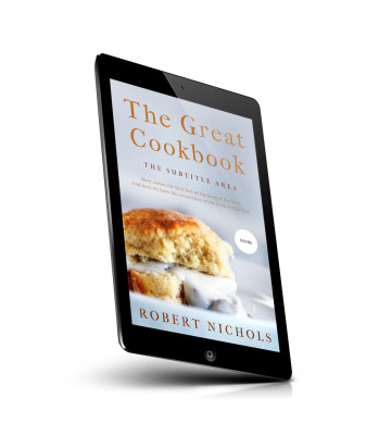 “A biscuit with gravy on a plate in the foreground, with the title "The Great Cookbook" and author "Robert Nichols" at the top.”
