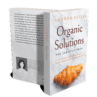 “A croissant on a marble surface with a book title and author's name above it.”