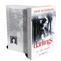 “A woman in vintage attire stands in a dimly lit train corridor.”