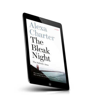 “A book cover with a title "The Bleak Night," author "Alexa Charter," and an image of a foggy bridge in the background.”