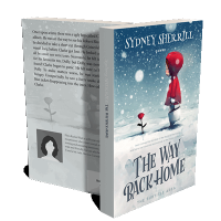 “A child in a red hood stands in the snow, holding a pail, facing a single red rose.”