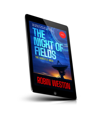 “A book cover with a satellite dish against a sunset and a blue, starry sky. The title is in large text, with an author's name at the bottom.”