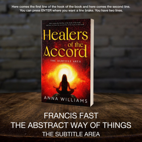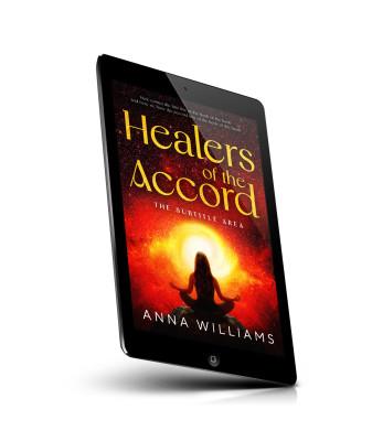 “A person is sitting cross-legged, meditating in front of a glowing, fiery background. The book title "Healers of the Accord" is displayed.”