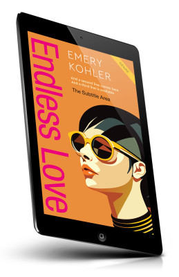“A stylized woman in sunglasses on an orange background with bold magenta text on the side.”