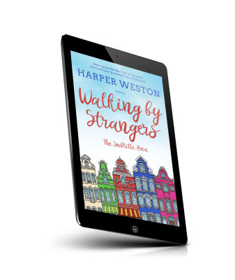 “Colorful row of European-style buildings under a blue sky with book title text above.”