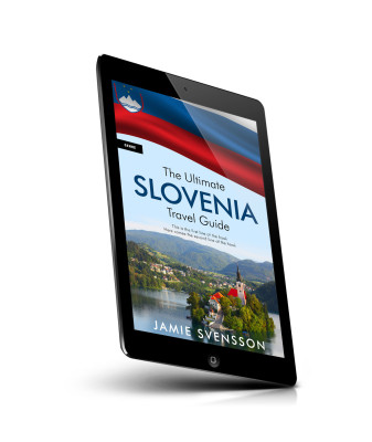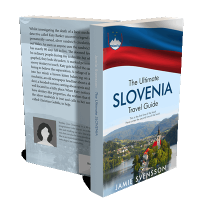 “A travel guide cover featuring a peaceful lakeside town in Slovenia with a church on an island and flag elements at the top.”