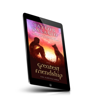 “Two figures, one human and one dog, sit facing each other against a vibrant sunset background.”