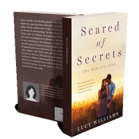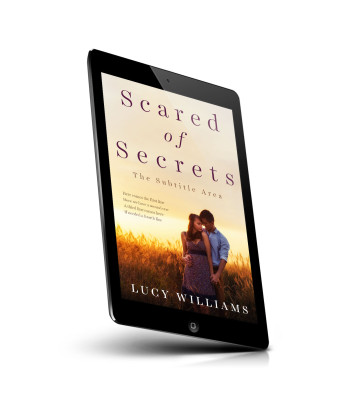 “A couple stands in a field at sunset, hugging. The title "Scared of Secrets" is centered at the top. The background displays tall grass.”