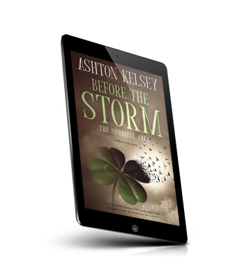“A four-leaf clover with birds flying out of it against a stormy sky with large text above.”