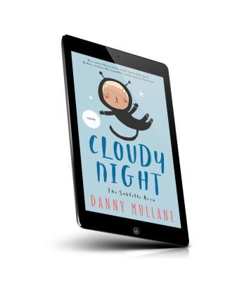 “A cute cartoon character in a cat costume is floating on a light blue background with the title "Cloudy Night" in bold letters below.”