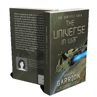 “A sci-fi book cover features a spaceship emitting blue thrusters, flying over a planet.”