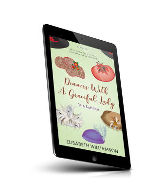 “Colorful hats surround the elegant book title "Dinners With A Graceful Lady" by Elisabeth Williamson on a light green background.”