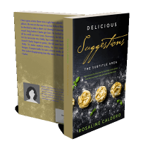 “Three pasta nests with scattered basil leaves on a dark surface, with elegant text above detailing a book titled "Delicious Suggestions".”