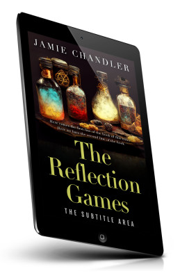 “Three decorative potion bottles on a dark background with a book cover design below.”
