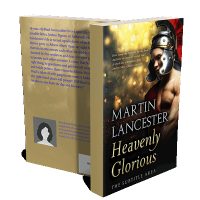 “A muscular man wearing a Roman-style helmet is depicted on the cover of a book titled "Heavenly Glorious."”