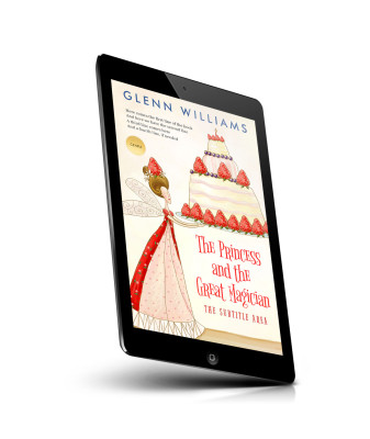“A whimsical illustration of a fairy-tale princess holding a cake adorned with strawberries, beside a tall tiered cake.”