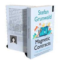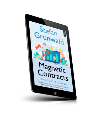 “A book cover with a blue background, illustrations of people and gears around a large laptop screen. The title is "Magnetic Contracts."”
