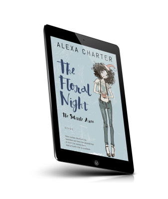 “A curly-haired girl in glasses and a hat holds a book against a blue background with "The Floral Night" in large cursive text.”