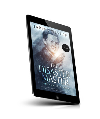 “A man holding a gun stands against a snowy, stormy backdrop. The title "The Disaster Master" is prominently displayed.”