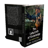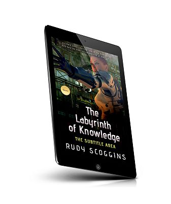“A futuristic character in armor pointing forward, with industrial background. Book title: The Labyrinth of Knowledge. Author: Rudy Scoggins.”