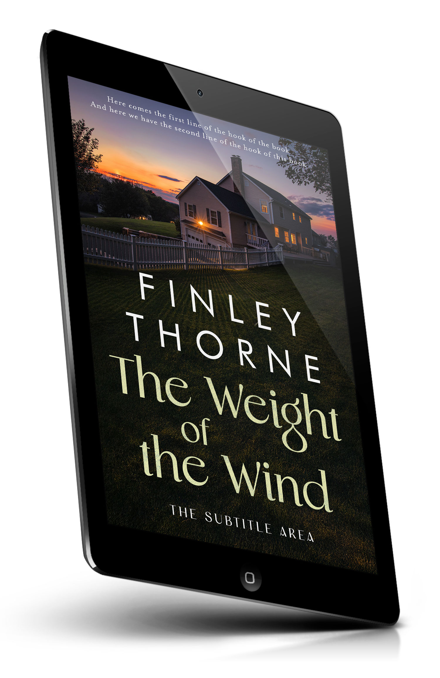 Tags: suburban, house, evening, twilight, sunset sky, dramatic clouds, hillside, lawn, picket fence, porch, chimney, warm windows, exterior lights, quiet neighborhood, rural edge, family home, serene, moody, dusk landscape, mystery fiction