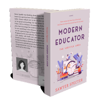 “Illustrated cover with people engaging in educational activities around a large clock, books, and school supplies.”