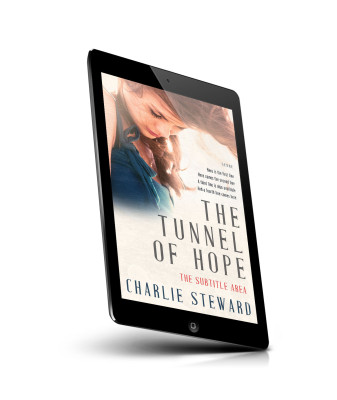 “A woman looks down pensively, with wavy hair blowing gently. The background features the book title "The Tunnel of Hope" and a subtitle area.”