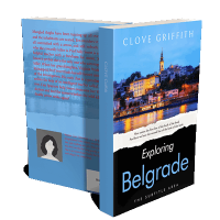 “A cityscape of Belgrade at dusk with illuminated buildings reflecting on the river.”