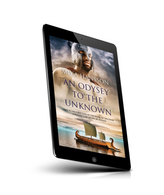“A warrior in armor stands against a dramatic sky. Below, a wooden ship sails on calm waters.”
