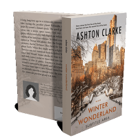 “A snowy park scene with a bridge, trees, and city skyscrapers in the background.”