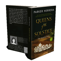 “A sparkling tiara rests on a wooden surface against a dark background. The text is gold and green in a luxurious, elegant font.”
