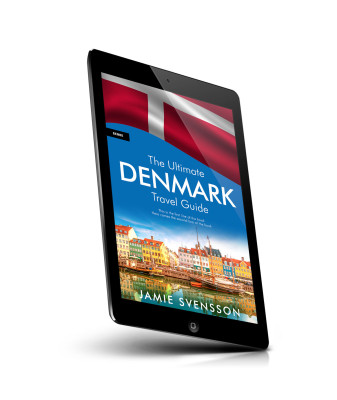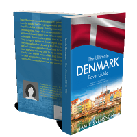 “Cover of a travel guide with a colorful harbor scene below a red and white flag.”