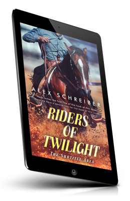 “A person in a plaid shirt riding a horse, with the title "Riders of Twilight" displayed prominently over the image.”