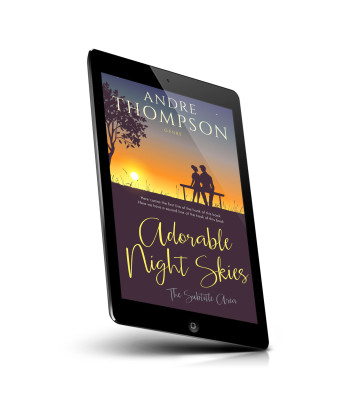 “Silhouette of a couple on a bench at sunset with trees, stars, and a large title in the foreground.”