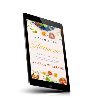 “An overhead view of a salad with various vegetables scattered on a white background and a book titled "Aromatic Harmonies" by Angela Williams.”