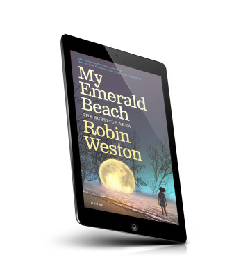 “A girl walks on a beach at twilight with a large, glowing moon in the background; trees and a serene sky complete the scene.”
