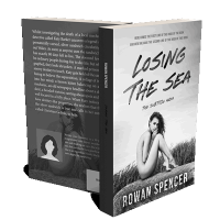 “A black and white book cover features a nude woman sitting outdoors on a rock, with tall grass and an overcast sky in the background.”