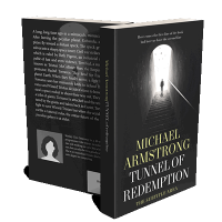 “A person walking up stairs in a dark tunnel towards a bright exit as birds fly in the distance.”