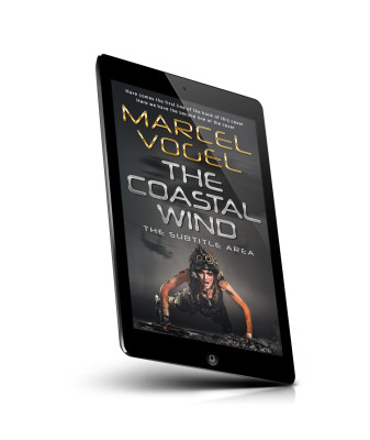 “A woman in aviator gear, crawling forward, with a dark, stormy background. The text above highlights the title and author.”