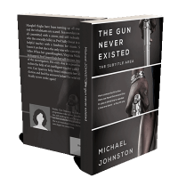 “Man holding a silver gun, wearing a watch. Dark background and minimalist design.”