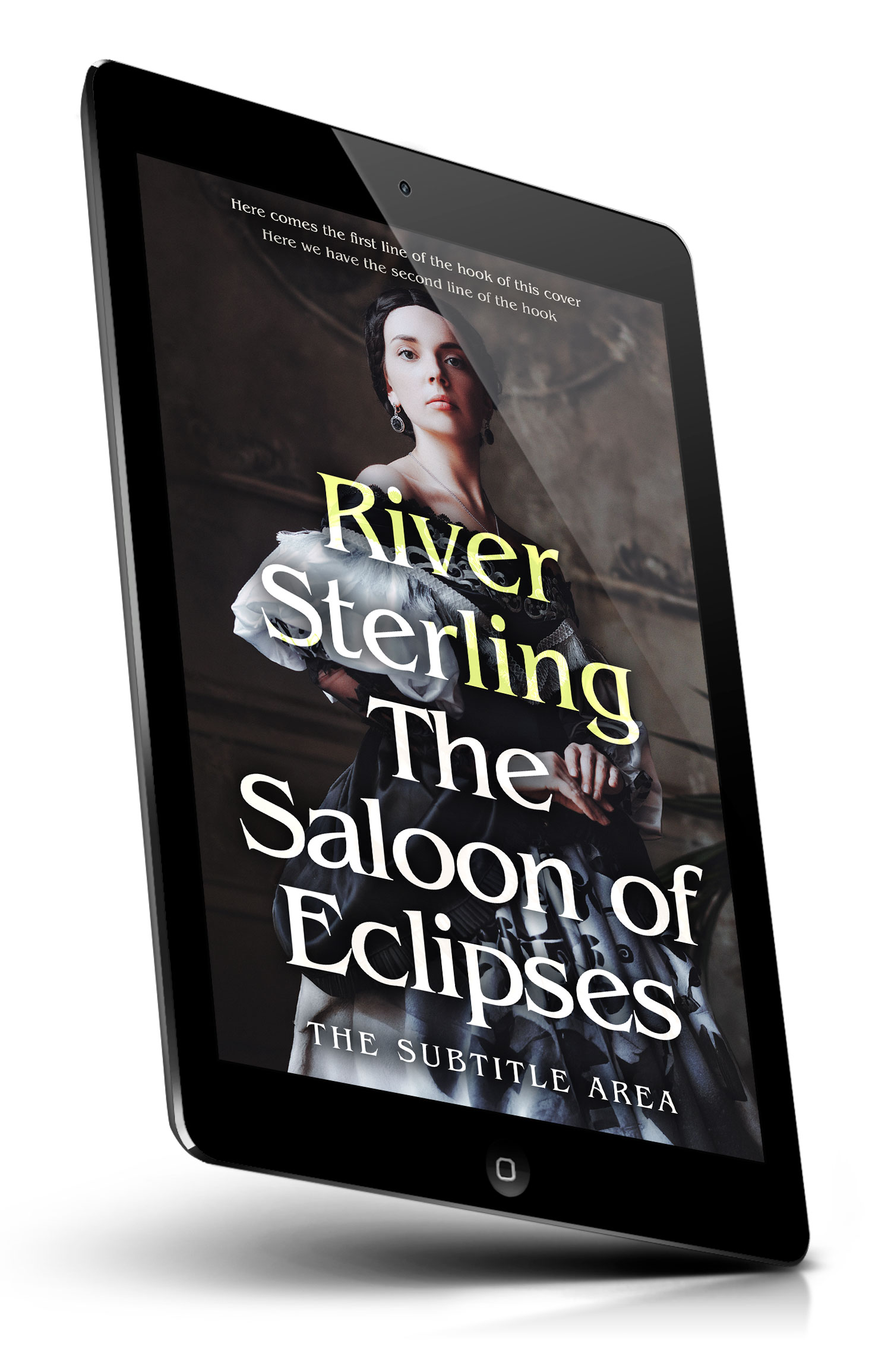 “A woman in an elegant Victorian-style dress poses against a dark, moody background, like a historical book cover.”