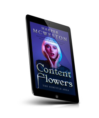 “A woman with short blonde hair, hands near her face, stands with a gradient blue to pink background. The title "Content Flowers" is prominent.”