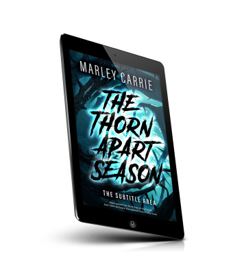 “Dark, thorny branches surround bold, jagged text on a teal glowing background creating an intense, mysterious atmosphere.”