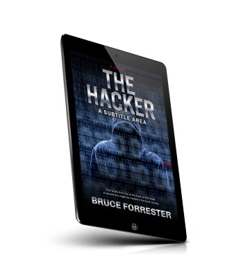 “Hooded figure with binary code background, featuring the title "The Hacker" and author "Bruce Forrester."”