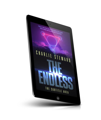 “A book cover features a glowing neon triangle and circles over a purple mountain range. The title is "The Endless."”