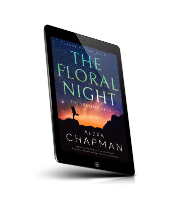 “Silhouetted person with flowers against a starry sky and colorful horizon.”