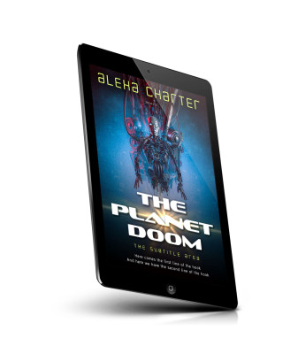 “A robotic figure with mechanical wings stands against a blue futuristic backdrop with circuits. Bold title reads "The Planet Doom."”