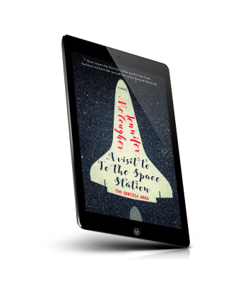 “An illustration of a space shuttle against a starry background, with text overlaying the shuttle.”
