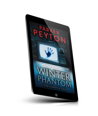 “A retro TV with a hand silhouette on the screen is above the title "Winter Phantom" in a mysterious, dark design.”